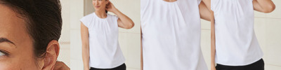 Women's pleat front blouse. Single button back neck opening. Capped sleeves. Straight hem. Fabric contains easycare, wicking, anti-UV, quick-drying properties. Matches HB590 range.