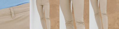 Women's slim fitting chino with added stretch for comfort and ease of movement. Includes YKK front zipper, belt loops, slanted side pockets, two single jet back pockets, back darts for added fit and DTM buttons.