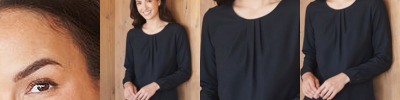 Pleat front blouse. Single button back neck opening. Set-in long sleeve. Slightly gathered sleeve at cuff with keyhole opening and button fastening. Slightly curved hem. Fabric contains easy care, wicking, anti UV, quick-drying properties.