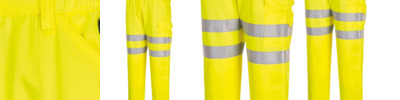 Certified recycled fabric. Breathable. Slim fit design. Tape gap on sides for maximum garment stretch. Reflective tape. CE certified. Certified to EN ISO 20471 after 50 washes. 40+ UPF-rated fabric.