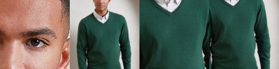 Men's long sleeve v-neck sweater. Soft feel/cotton rich yarn. Ideal for wearing with or without a tie. Fine gauge knit. Contemporary styling. Set in sleeves. 40°C domestic wash.