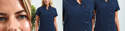 Beauty and Spa tunic with Mandarin collar. Asymmetric button fastening to the front with 8 bar shaped buttons. Short sleeve. Side vents. Back pleat for ease of movement. Princess seams. Easycare.