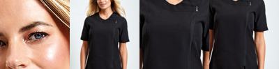 Beauty and Spa tunic with cross over neckline and asymmetric zip front. Short sleeve with vented cuff. Side vents. Princess seams with top-stitch detail for flattering fit. Easycare.