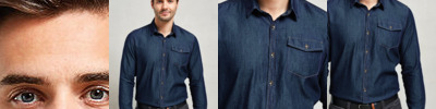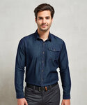 Long sleeve denim shirt with contrast stitch detail with left breast pocket. Buttoned cuff and sleeve guard. Curved hem. Back yoke.