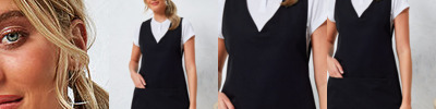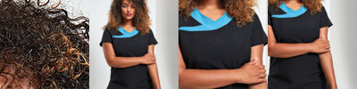 Beauty and spa tunic with panel detail. Black contrast panel detail around front neck line. Princess seams and bust darts for flattering fit. Side vents. Back zip fastening. Short sleeves. Easycare. Made from Oeko-Tex® Standard 100 fabric.