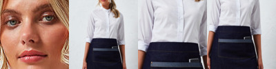 Mid-length denim waist apron with two large metal eyelets that secure the waist ties. Large centre pocket measuring 36cm wide with combined pen pocket. Contrast trim on pocket and ties gives a two-tone denim effect. 50cm long by 70cm wide.