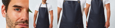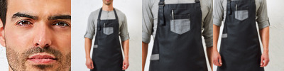 A full bib apron with style features taken from the popular 'chino' style. A stitched patch pocket with rivets features at the centre top and two side pockets big enough to carry tablet devices sit just below waist height. The neck strap is loose and the wearer can loop the end through the buckle and use the pop-snap buttons to fasten in place.