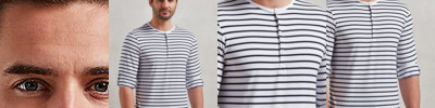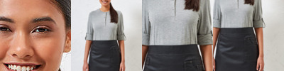 Long sleeve tee that has roll sleeve capabilities with button tab on the inside of the sleeve to secure in place. Round neck style with a three button placket. Twin-needle stitching to the hem and cuff.