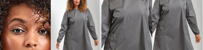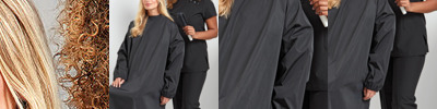Waterproof and bleach resistant for use in salons and barbers. Elasticated cuffs. Adjustable tear release fastening. Measures 108cm long.