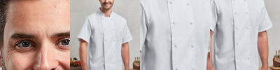 Ten button wrap over. Double pen pocket. Mandarin collar. Coolchecker® back panel.