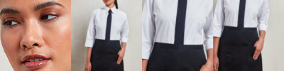 Mid-length waist apron. Tablet-friendly centre pocket with combined pen pocket. Self-fabric ties. Contains certified recycled polyester.