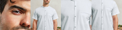Lightweight short sleeve chef’s shirt made with certified recycled polyester. Mandarin banded collar and press stud closure. Contrast inner neckband. Two pen pockets on left arm. Welt pocket to front left chest with combined pen pocket and faux top stitching. Pocket bag can be moved to allow for embroidery. Back yoke with pleats for ease of movement through chest and shoulders. Press stud tab to the back for hanging or securing an apron in place. Reinforced side seams.