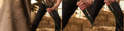 Woven stretch fabric with a DWR (Durable water-repellent) finish. Ripstop stretch fabric to knee, seat panels and re-enforcement at the hem. Part elasticated waist and high back waistband. Multi pocketed with front and rear zipped pockets.