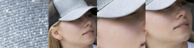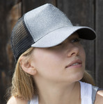 5-panel cap (4 mesh/1 fabric). Sparkle fabric stiffened front panel and peak. Mesh back with ponytail hole. Tear-release adjuster. Semi-curved fabric peak made from recycled plastic. Tear-away label.